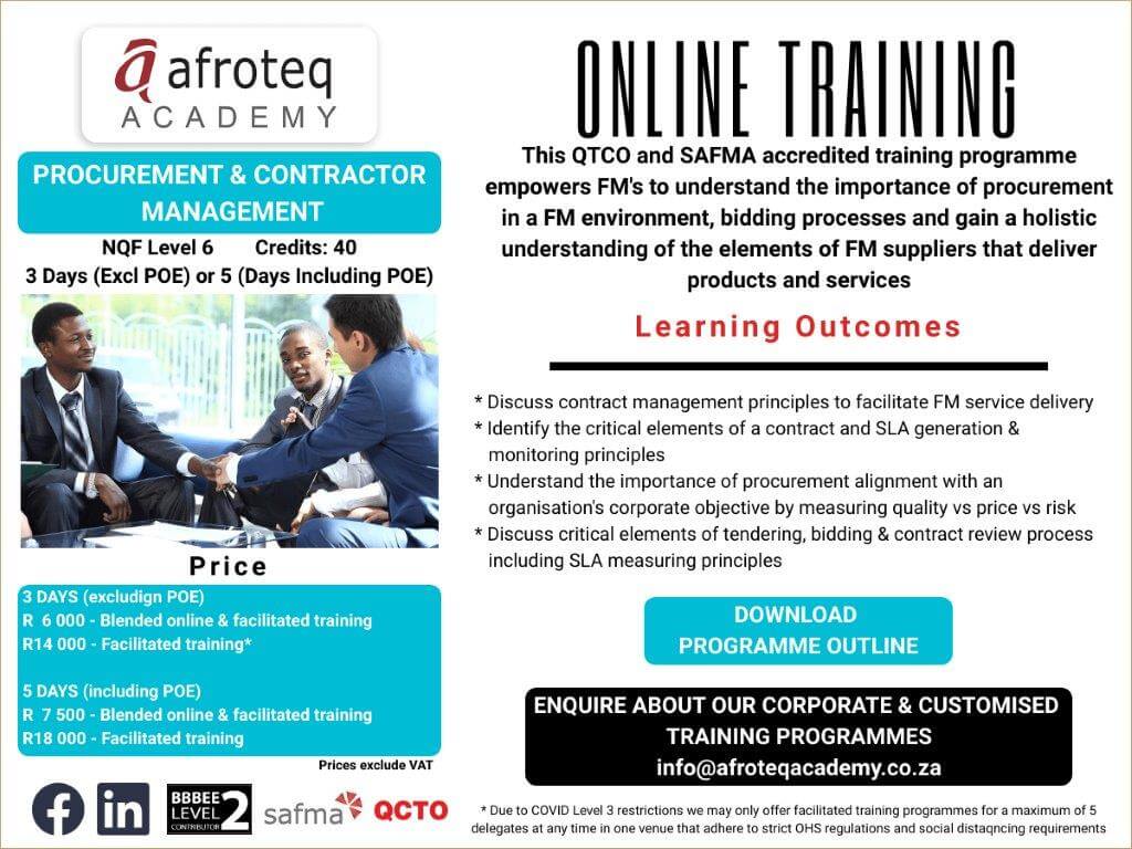 She has 20 years of practical experience in the facilities management and human resources industry. Being part of the Afroteq Academy management team and facilitating various training programmes, she has contributed to the course content and its ongoing relevance to industry standards.